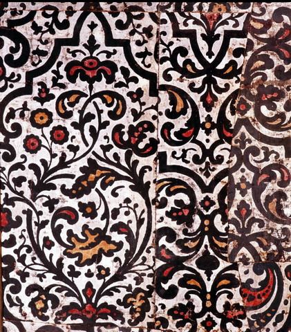 De modegevoelige 18de-eeuwse Nederlander hield van patronen op de wanden van zijn woonvertrekken. Goudleer was net als in de 17de eeuw een geliefde wandbekleding, maar ook stof was zeer in trek. Stoffen behangsels waren meestal duur. Samen met de bijbehorende gordijnen en bed- en stoelbekledingen vormden ze doorgaans het waardevolste onderdeel van de inrichting van een huis. Zeer gewild was de prachtige geschoren velours uit Genua. Dat was een stof met een zijden pool die in patronen was weggeschoren en in verschillende tinten gekleurd. Omdat deze bijzonder kostbaar was, bedacht men een methode om het effect van dit fraaie materiaal na te bootsen. Met behulp van sjablonen werd gekleurd wolknipsel op een van tevoren met lijm bestreken ondergrond van linnen of papier gestoven. Het velouté-behangsel in de Erkerkamer van kasteel Het Nijenhuis is volgens de overlevering afkomstig uit een huis aan de Herengracht in Amsterdam. Het is misschien in Nederland gemaakt, maar kan ook van elders zijn ingevoerd. De symmetrische opbouw van het patroon herinnert aan de periode omstreeks 1700, toen patronen van Daniël Marot in de mode waren (zie ook pag. …). Maar asymmetrische onderdelen zoals de gekrulde bladeren boven de vazen geven aan dat dit voorbeeld vermoedelijk rond 1730 is vervaardigd, in de begintijd van de grillige rococostijl. Reinier Baarsen 2005.