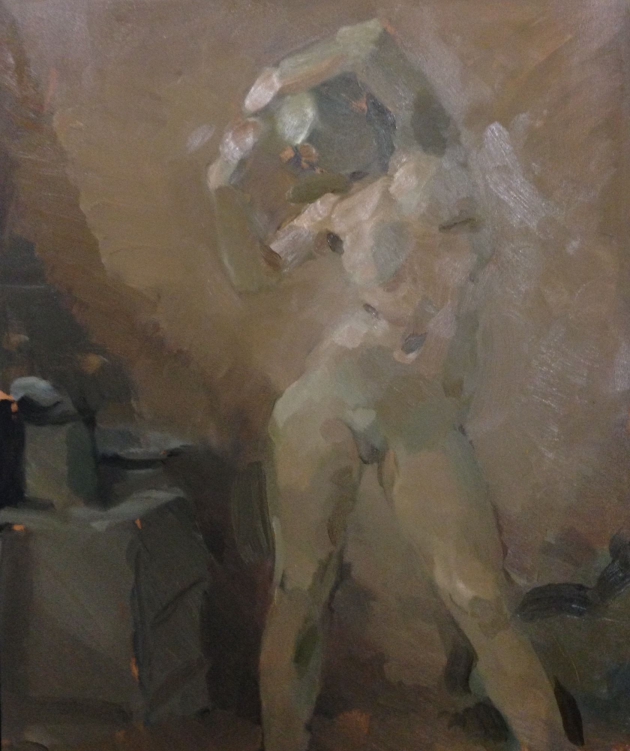 - Staand vrouwelijk naakt met de handen op het hoofd